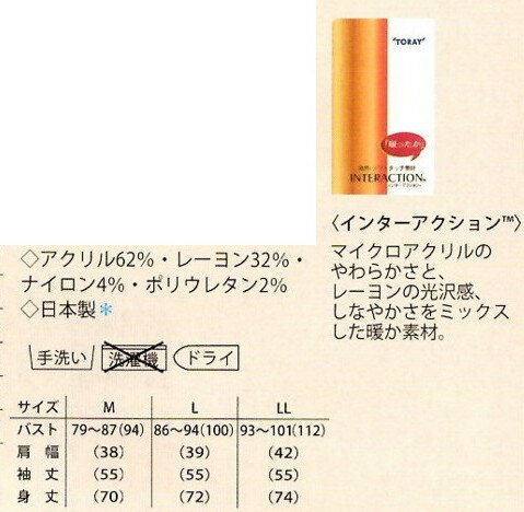 ◇本体:アクリル 60%,レーヨン 33%,ナイロン 5%,ポリウレタン 2% 別布:ポリエステル 65%,レーヨン 35%,◇日本製 ◇マイクロアクリルのやわらかさと、しなやかさをミックスした発熱・暖か素材<インターアクション>使用。